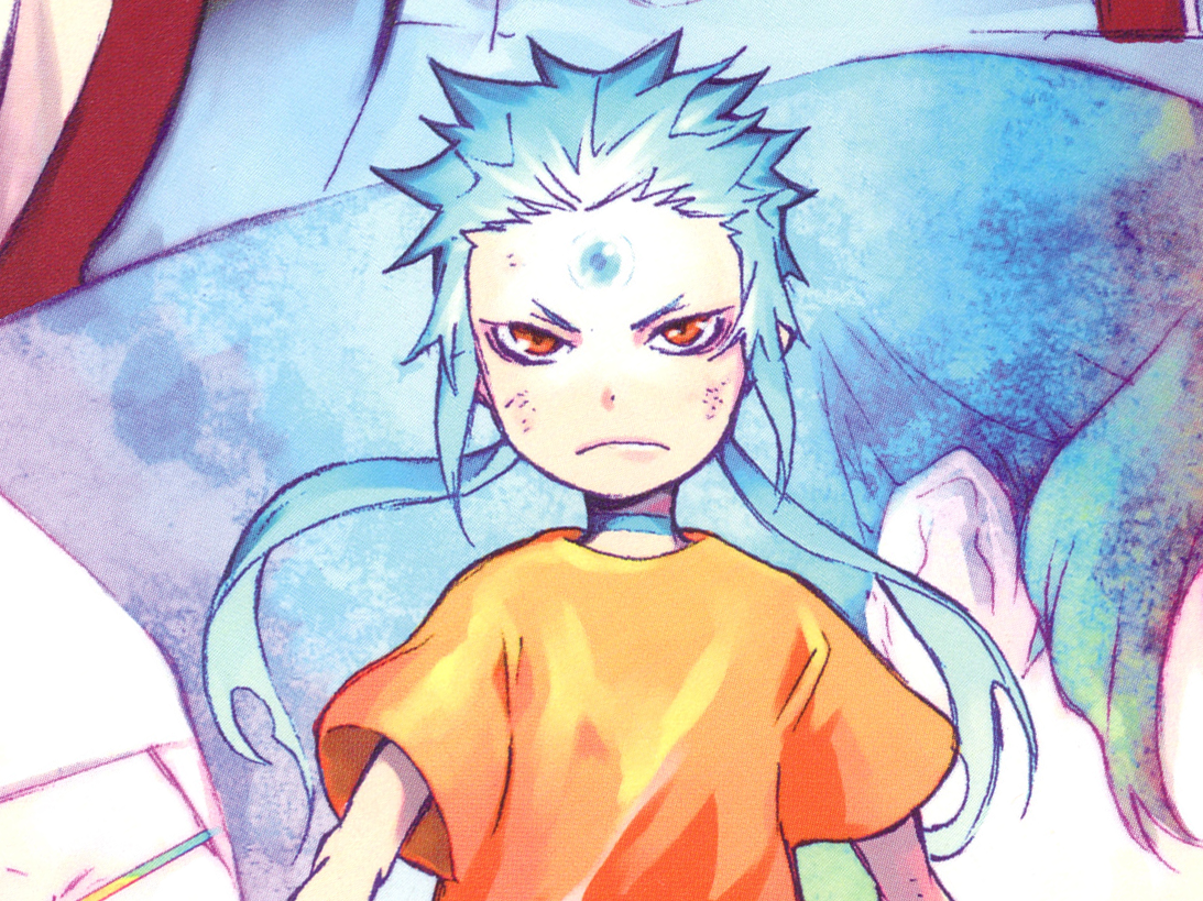 Timothy is a boy of average weight and height.He has a blue mullet-like (short hair at the front and sides and long at the back) haircut and brown eyes.[1][2] His hair was originally brown, but turned blue when he awakened Tsukikami. At the orphanage he wore rather normal clothing consisting of a large striped bandanna[3] (to cover his innocence), an orange baggy shirt, brown cropped pants, a blue choker around his neck and pointy slippers.[4][5]